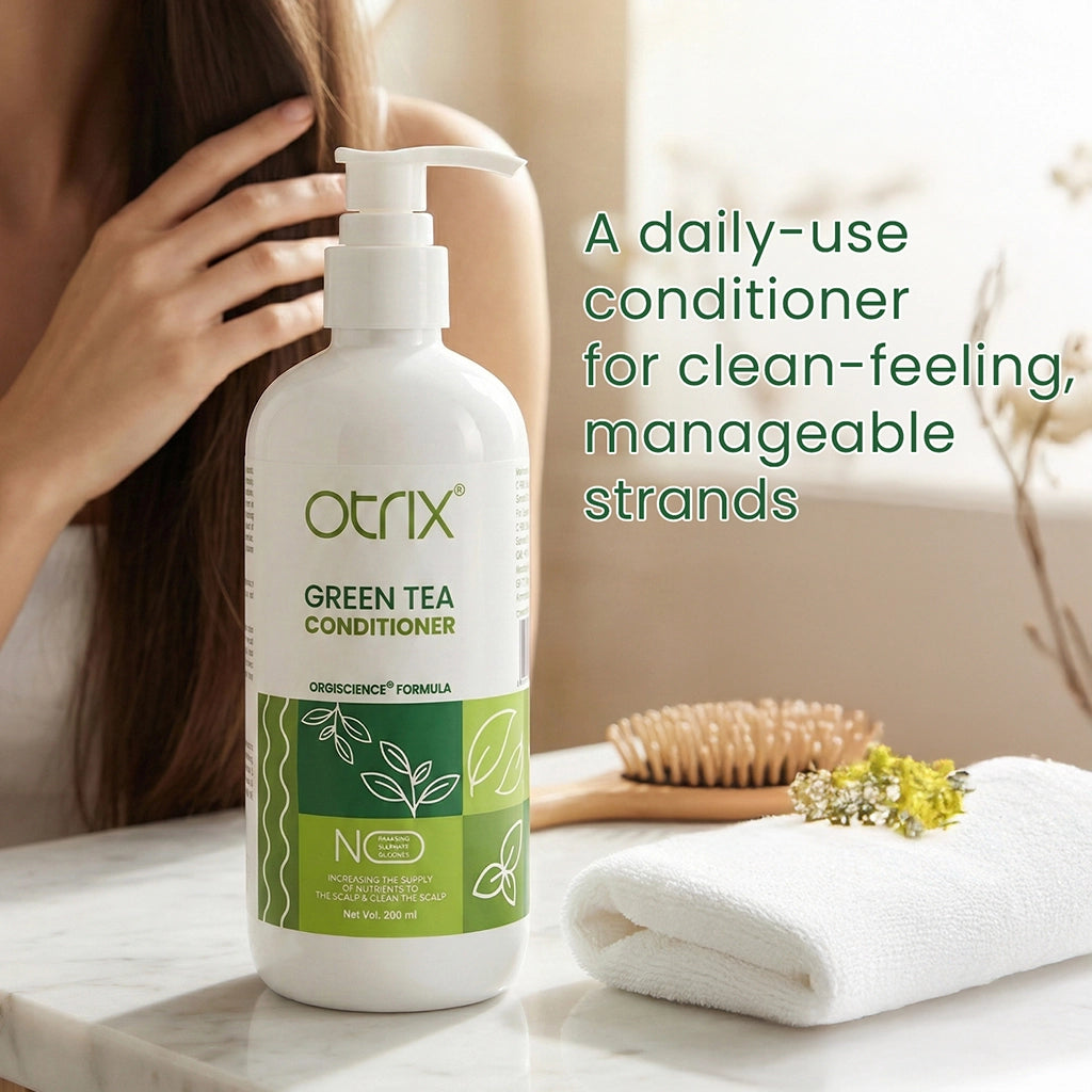 Observe your hair bloom with natural radiance and a revitalizing freshness with Otrix Green Tea Hair Conditioner.