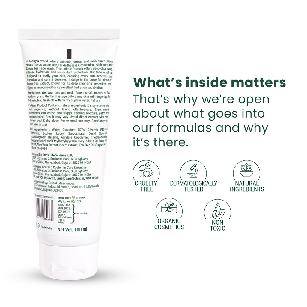 Otrix Green Tea Face Wash, is enriched with plant extracts and devoid of harsh chemicals and parabens. It is a safe and natural option for your regular skincare regimen. Green tea suits all skin types, even sensitive skin, because of its lightweight and non-sticky consistency. Regular users can see extraordinary results such as reduced tan & wrinkles, and increased elasticity.