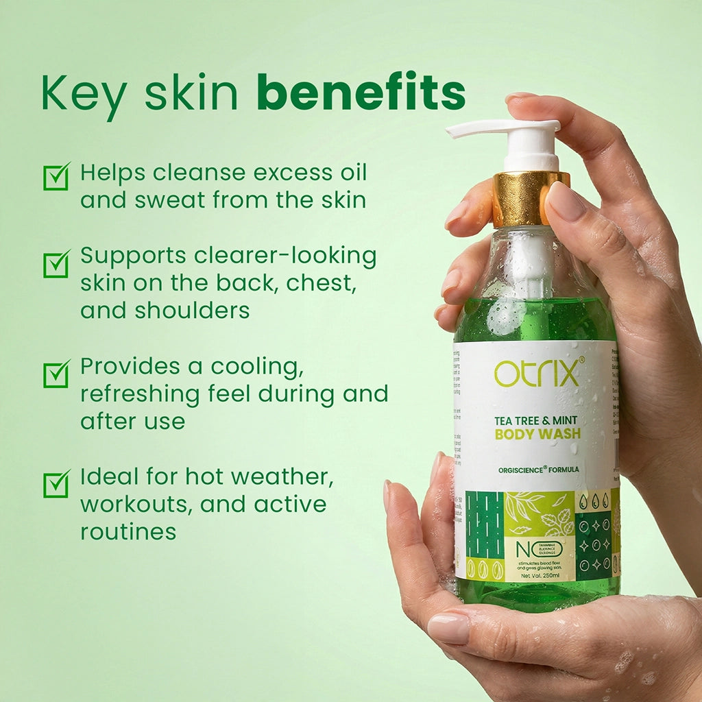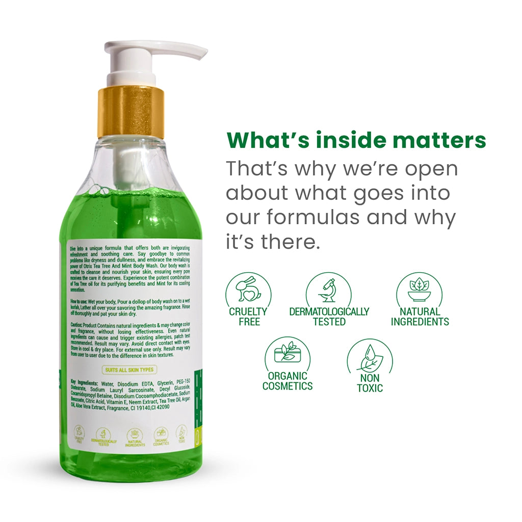 Otrix Tea Tree and Mint Body Wash is an exciting combination of natural components. Infused with the purifying powers of tea tree oil and the cooling feeling of mint, it delivers a refreshing cleansing while calming and moisturizing your skin. Crafted with nature's best components to revitalize the senses and adapt to your skin.